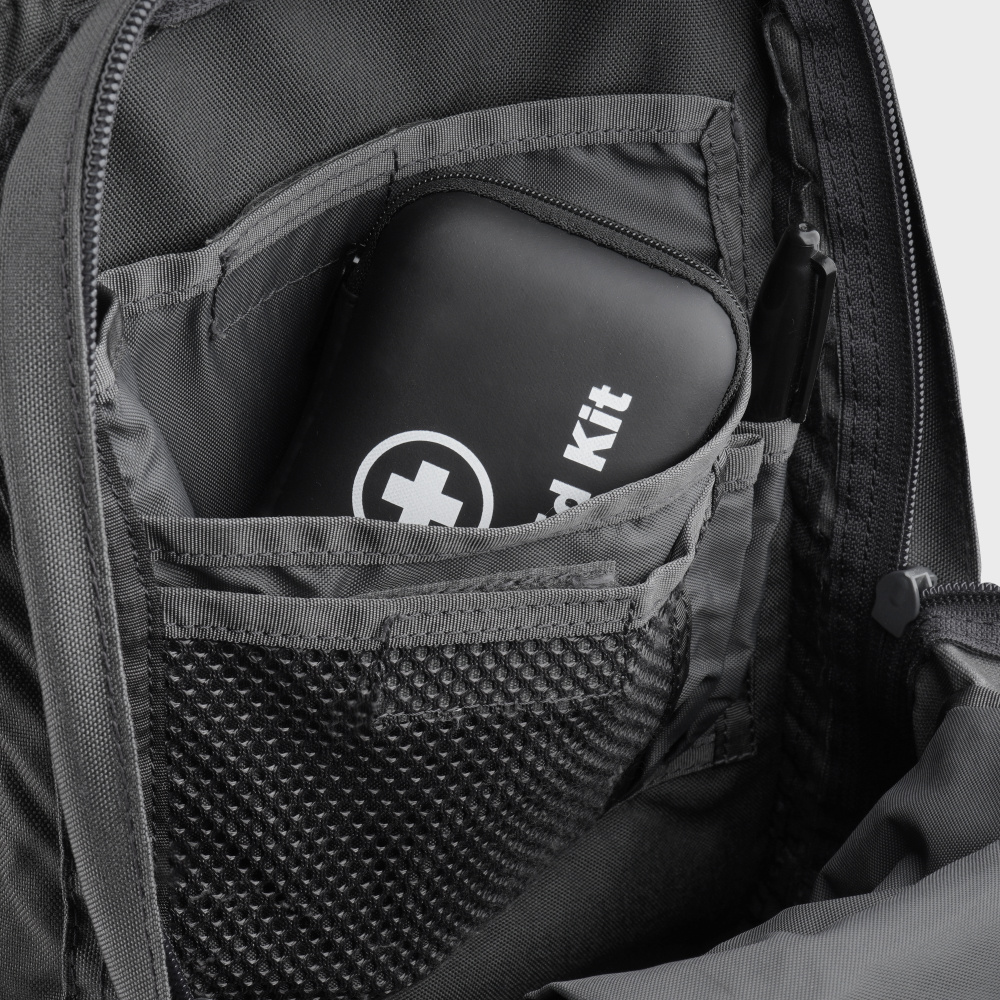 Der Deckel hat zwei Netzfächer, in denen die mitgeführten Verbände untergebracht werden können. Ein Fach ist mit einem Kreuzkragen versehen, das andere mit einem vertikalen Kragen, der es Ihnen ermöglicht, den Platz der mitgeführten medizinischen Hilfsmittel anzupassen. Der Reißverschluss ermöglicht es Ihnen, den Inhalt des Erste-Hilfe-Kits zu sichern. Dank seiner geringen Größe lässt er sich problemlos in einen taktischen Rucksack packen oder als zusätzliches Erste-Hilfe-Set im Auto mitführen.
