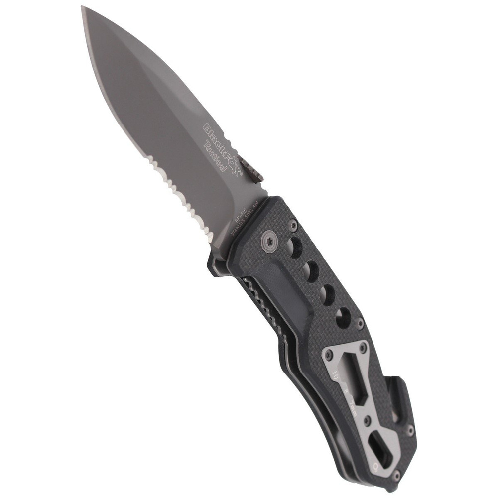 - Klappbares Rettungsmesser mit teilweise gezahnter Klinge, Glasbrecher und Gurtschneider. Das Messer hat eine Klinge mit Drop Point Profil und Griffe aus G10. Liner Lock ist für die Sicherheit des Benutzers verantwortlich. Farbe: schwarz.