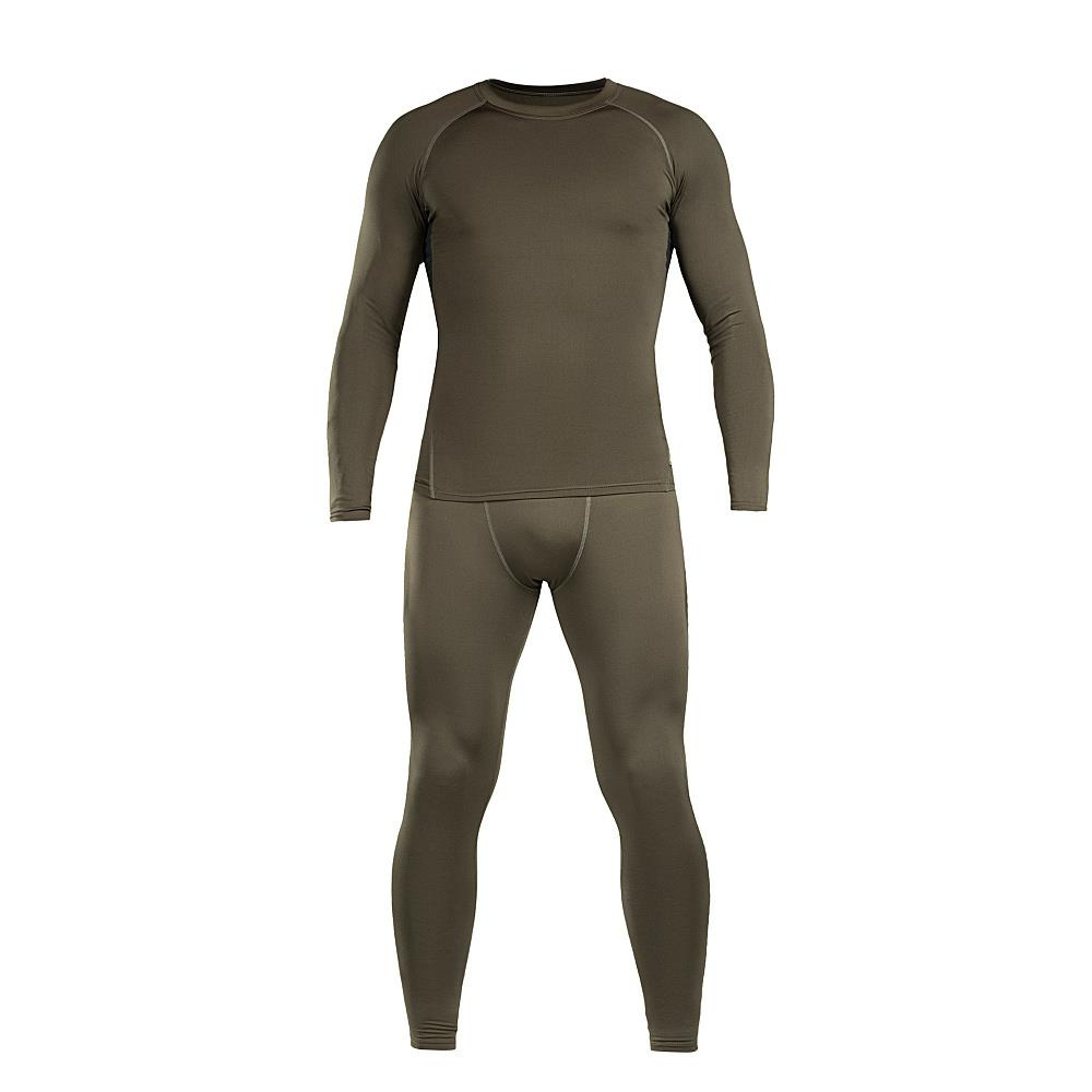 Składający się z koszulki z długim rękawem i leginsów komplet bielizny termoaktywnej. Wykonany z mieszanki poliestru i spandexu, idealny jako pierwsza warstwa odzieży w trakcie wszelkiego rodzaju aktywności fizycznej. Świetnie nada się do noszenia pod bluzą mundurową.