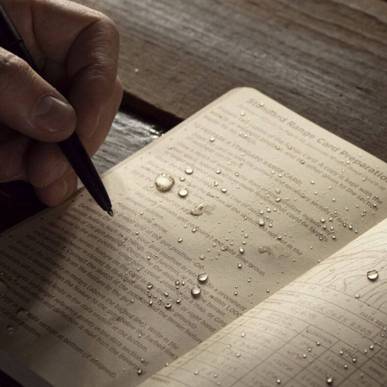 Zestaw trzech notesów wodoodpornych, każdy w rozmiarze 4,625 x 7", najbardziej zbliżonym do formatu B6. Strony każdego z notatników złączone są zszywkami o zwiększonej odporności na utlenienie, dzięki czemu zeszyt nagle się nie rozleci. Na końcu umieszczone zostały umieszczone strony z instrukcjami i wzorami informacji, które docenią wojskowi podczas przebywania w terenie.